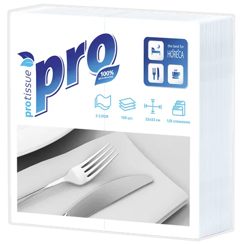 Белые салфетки PROtissue, 2-слойные, 1/8 слож., 33х33 см, 100 листов, плотность 16 г/м, упаковка 1/24 (С233)
