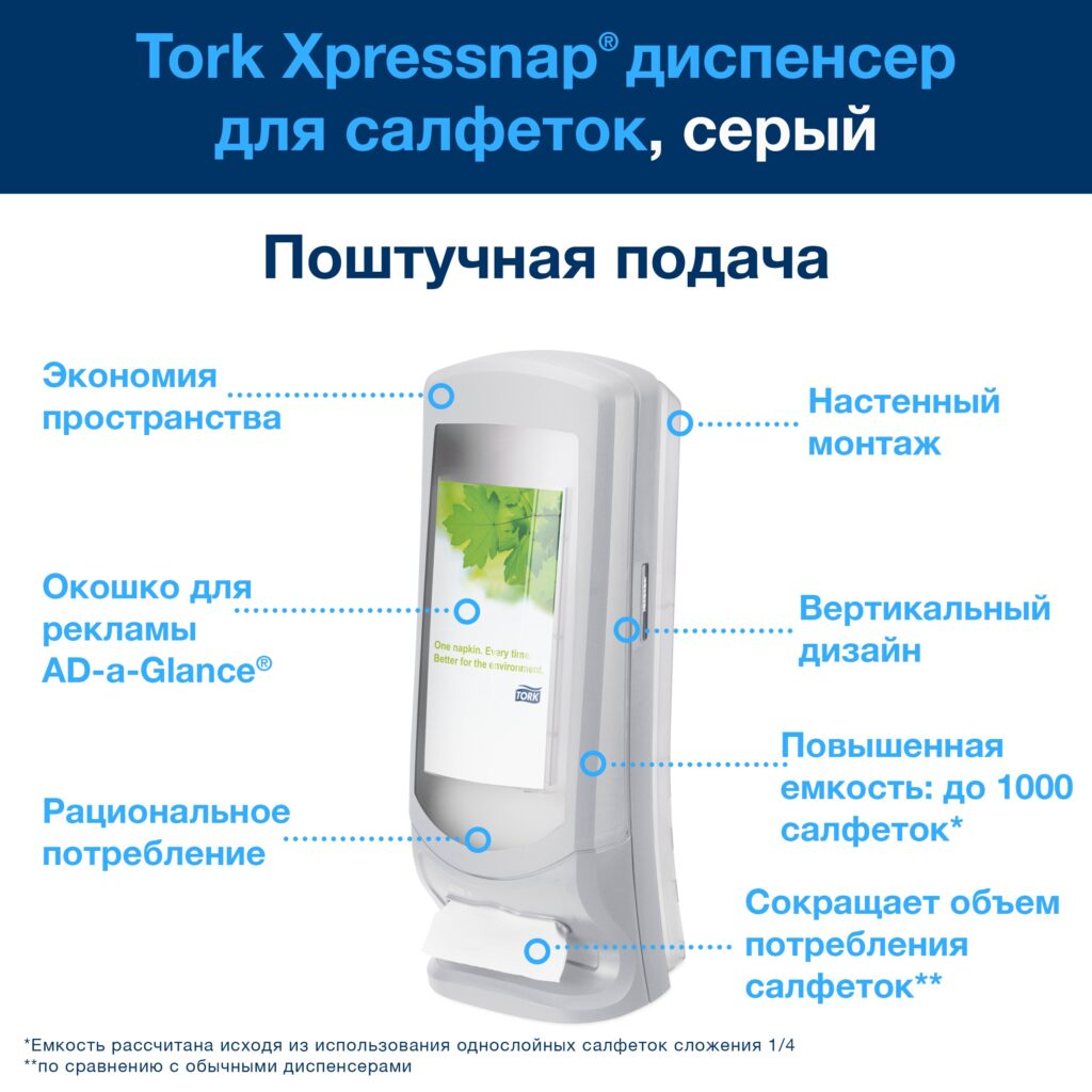Диспенсер Tork Xpressnap большой емкости для столовых салфеток — это промышленное решение для заведений с экстремально высокой проходимостью, таких как столовые, фуд-корты, кейтеринговые компании и крупные рестораны. Его вместимость в 1100 салфеток позволяет значительно снизить частоту замены, что экономит трудозатраты персонала и минимизирует простои. Механический рычажный механизм обеспечивает точную, дозированную подачу одной салфетки за раз, что предотвращает перерасход и поддерживает чистоту. Корпус из прочного ABS-пластика устойчив к механическим нагрузкам и влаге, а серый цвет маскирует следы эксплуатации. Прозрачное окно контроля заполнения позволяет оперативно реагировать на необходимость пополнения, а антивандальная конструкция с ключевым замком защищает дорогостоящие запасы от кражи. Этот диспенсер — это инвестиция в стабильность и эффективность. Для руководителей сетей и крупных предприятий, где каждая минута простоя — это потеря, он является незаменимым элементом системы обслуживания, обеспечивающим бесперебойную работу и высокий уровень сервиса.